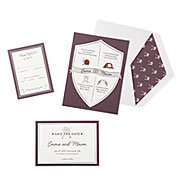 Once a symbol of heraldic achievement, the crest becomes a charming symbol of just that—finding each other. The crest on these invitations features whimsical drawings that tell the unique story of your special day, creating a keepsake cherished for decades to come. They're letterpress-printed by premier stationery company Crane on heavy-weight paper to give the design elegant texture. Adding a delightful touch are the clinking champagne glasses that pattern the back of each invitation as well as the envelope linings. Choose from a selection of background colors. Coordinate your invitations with complementing Save the Dates and RSVP cards. Inspired by our charming Coat of Arms art illustrated by Patricia Carlin. Printed in the Berkshires of Massachusetts. Click here to see all color options and customization options. For special inquiries, please contact dropship@uncommongoods.com. When you order samples, we'll credit the amount toward your invitation purchase.Wedding Crest Wedding Stationery